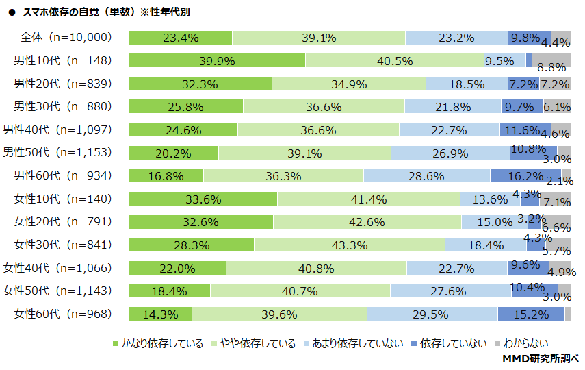 次に、いわゆる「スマホ依存」についての調査です。性年代別で見たところ、「かなり依存している」は男性10代が約33.9%、女性10代が33.6%、女性20代が32.6%の順となっています。