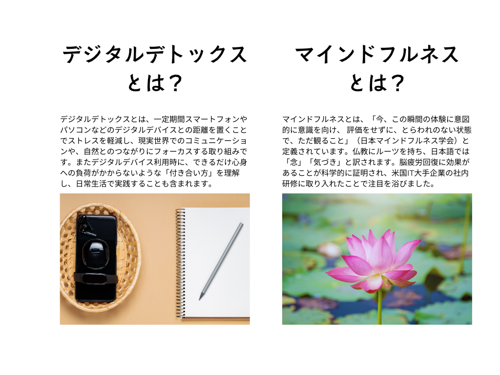 デジタルデトックスとマインドフルネスを相互に深めるアプローチを採用。