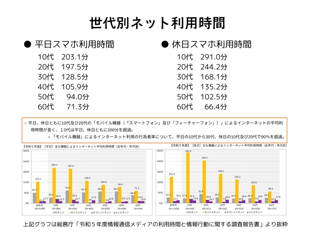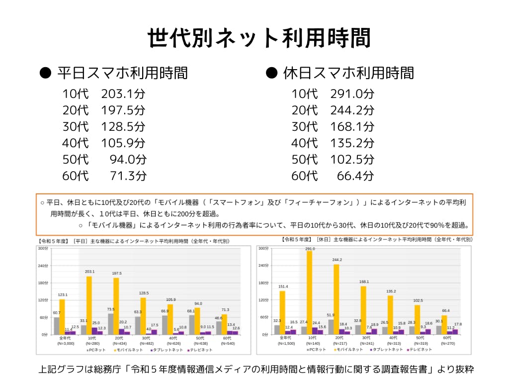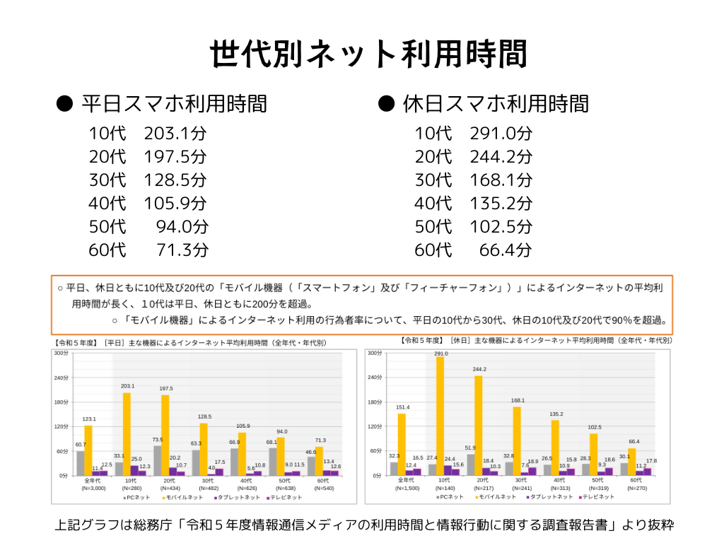 調査では、スマホのデジタルデトックスに興味を持つ人は全体の半数近く。特に10代や20代の若い世代で「ぜひ試したい」という声が多く、総務省のデータでも若い世代ほどスマホ使用時間が長く依存度が高いことが明らかになっています。一方で、40代以上の世代ではスマホ利用時間が減少しており、興味を持つ層と実際にデジタルデトックスが必要な層が必ずしも一致しないという現実があります。