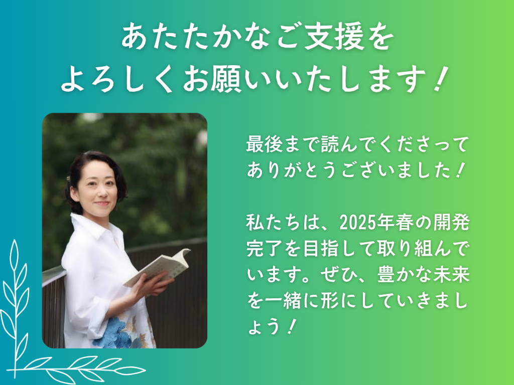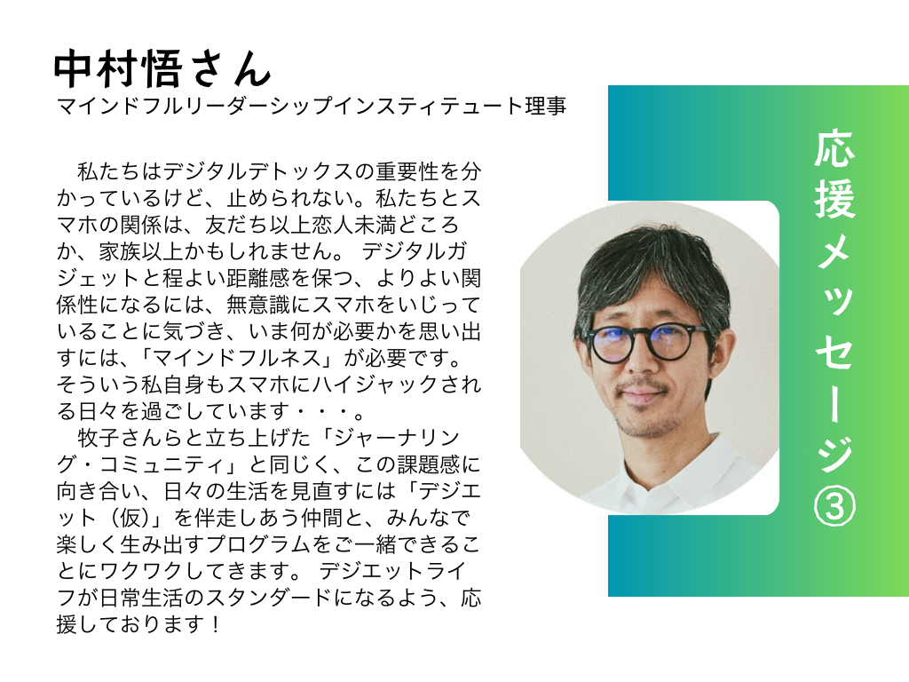 このプロジェクトを通じて、多くの方と「問い」を共有し、一緒に「持続可能なデジタルライフの実現」について考えていきたいと思っています。不安や罪悪感からではなく、「確かに、ちょっと試してみようかな・・・」という気軽な気持ちで、マインドフル・デジタル・ダイエットを始めてみませんか?毎日が忙しいと感じる方こそ、試していただければとても嬉しいです。デジタルとの時間を少しずつ見直し、豊かな日常体験へ意識を戻していく。新しい発見と心の余裕を持つ日々を、皆さんと一緒に作り上げていきたいと思います!