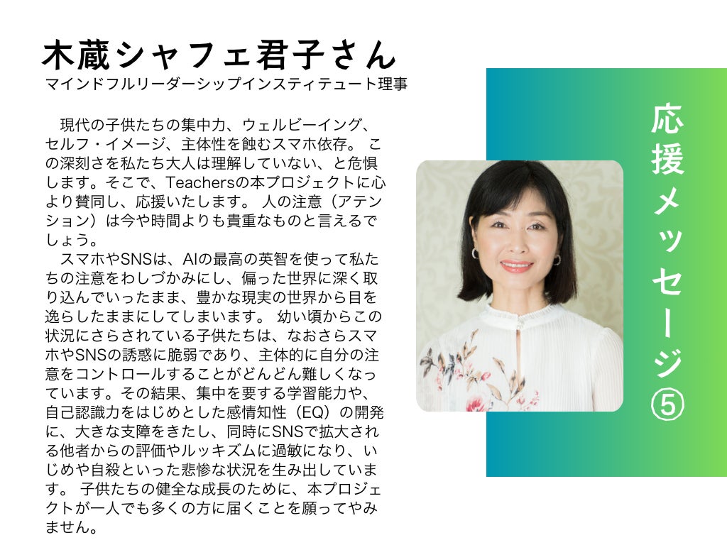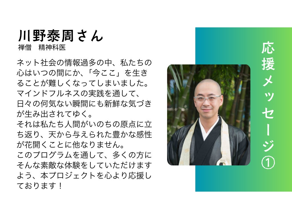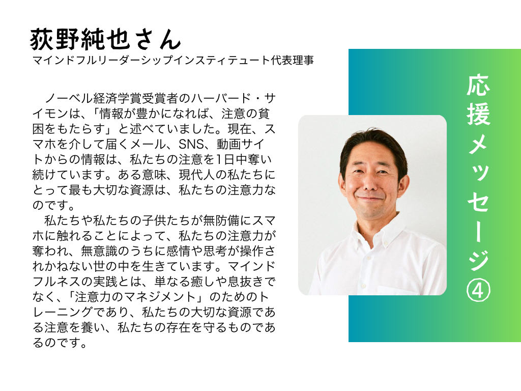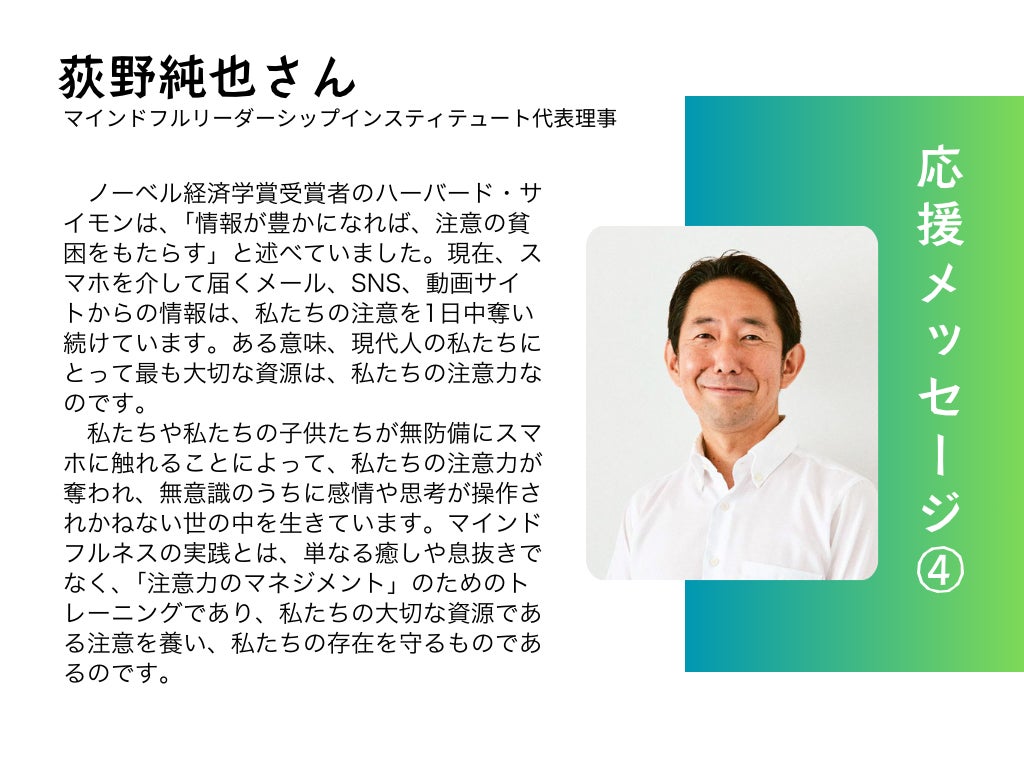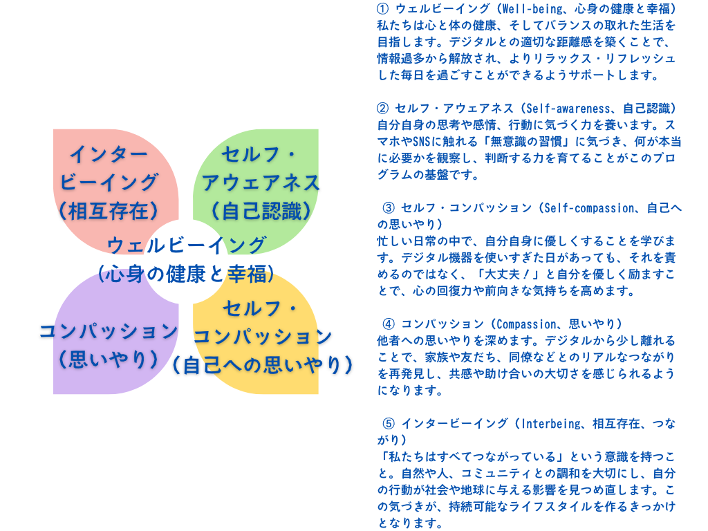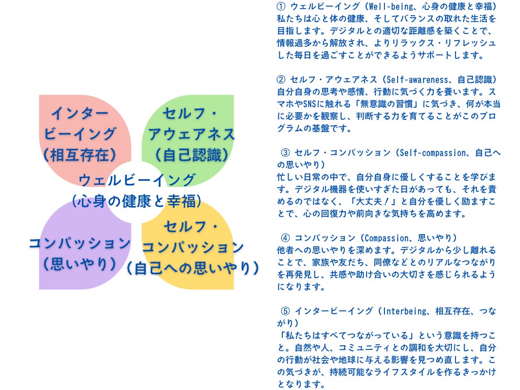 だからこそ、私たちはマインドフルネスを基盤とした「デジタルデトックス」を広めたいと考えています。他者を理解し、共感し、支え合う力を育むためには、デジタルとのバランスを取り戻すことが大切です。