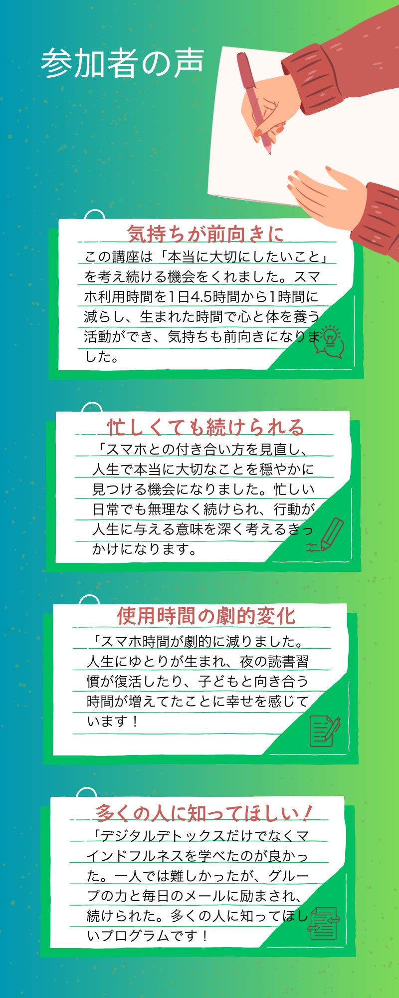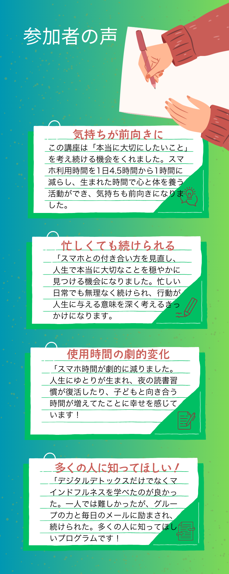 よりよいプログラムを開発するには、実際に体験してくれるモニターが必要です。私たちは、より良いデジタルデトックスプログラムを作るために、あなたの体験とご意見を必要としています!この機会に、私たちのプログラムを実際に体験し、感じたことをぜひアンケートで教えてください。