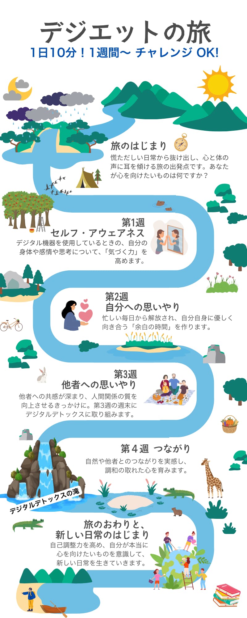 私たちのプロジェクトは、年齢やライフスタイルに関わらず、「誰もが気軽に始められるデジタルデトックス」を実践できる環境と学びの場を提供することを目指しています。