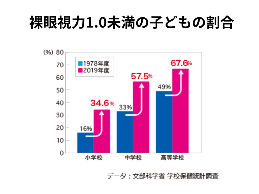 「なぜ子どもの近視が増えているのでしょうか。近視は遺伝と生活環境の両方が関与していると言われていますが、近年、子どもの近視が激増しているのは、子どもたちを取り巻く現代の生活環境の変化の影響が大きいと考えられています。」