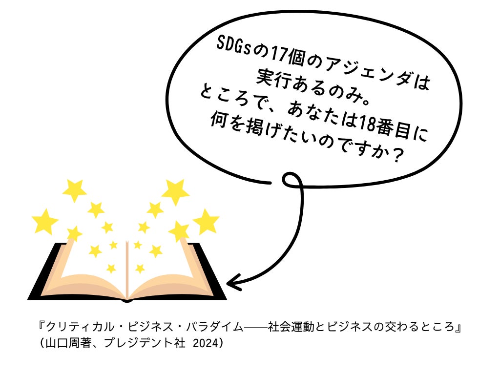 そんな中、山口周さんの新刊『クリティカル・ビジネス・パラダイム』で出会った一文が心に響きました。「SDGsの17個のアジェンダは実行あるのみ。ところで、あなたは18番目に何を掲げたいのですか?」