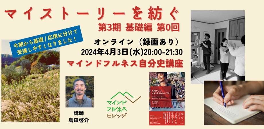 そして最後にご紹介するのが、マインドフルネス・ビレッジ村長の島田啓介さんが講師を務める「『マイストーリーを紡ぐ』 ~ ありのままの自分に帰るためのマインドフルネス自分史講座」です。今年で3年目を迎えたこの講座は、半年をかけて自分の半生をマインドフルネスとコンパッションの視点で深く振り返り、自らの人生を物語として言葉に紡いでいくという内容です。単なる過去の出来事の羅列ではなく、人生の意味や気づきを掘り下げ、再編集することで、「ありのままの自分」に出会う旅へと導きます。この講座は多くの参加者から共感を呼び、ありがたいことにリピーターも続出する人気講座へと成長しました。自分の人生を見つめ直す機会を通じて、これまで気づかなかった新たな価値観や自己理解を深める場として、多くの方々にとって(そして私自身にとっても)、かけがえのない体験となっています。