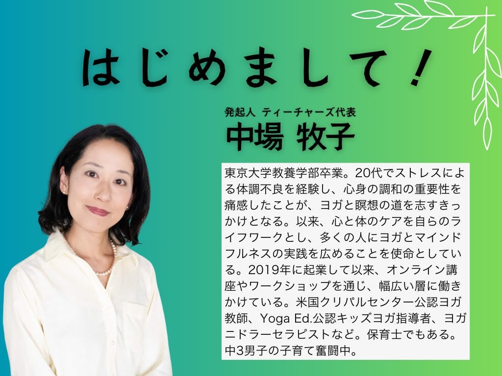 はじめまして!「マインドフルネス・ビレッジ」を運営している、ティーチャーズ株式会社代表の中場牧子と申します。マインドフルネス・ビレッジとは、島田啓介さんを村長にした「生活の中でのマインドフルネスの実践」を大切にするコミュニティです。オンラインを中心に、日々の暮らしに「気づき」を導き入れることにより、マインドフルネスの習慣化のサポートをしています。