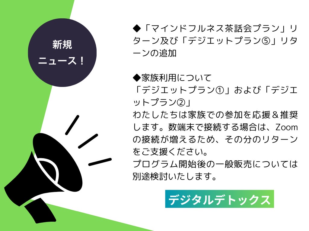 グループワークで行うモニター大募集! 『デジエット(仮)』ノートPDF&冊子(1冊) + 4週間体験 デジタルデトックスを仲間と一緒に実践! 4週間の特別体験を通じて、新しい自分と向き合うチャンスです。二つの日程(録画あり)から選べます。