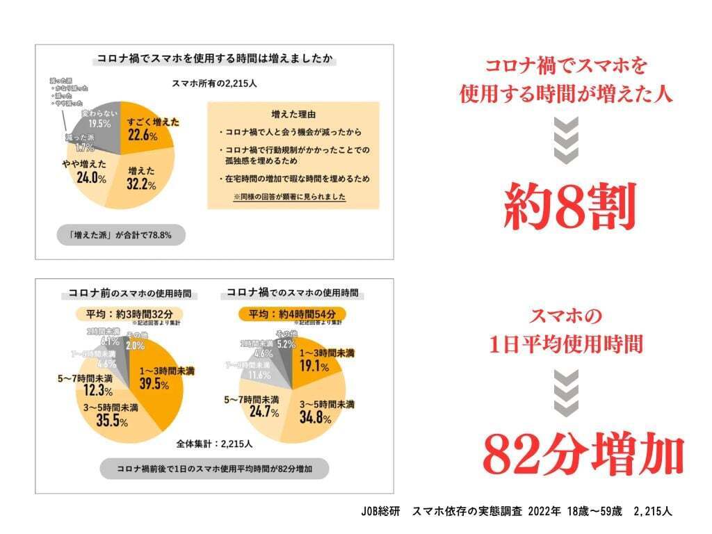 コロナ禍ではリモートワークやオンライン授業が当たり前となり、テクノロジーが日常生活に欠かせない存在になりました。しかしその一方で、スマホやSNSの使い過ぎによるデジタル依存や疲労を感じる人が増えています。ある調査では、コロナ禍でスマホの利用時間が増えた人が8割近くにも上るといいます。