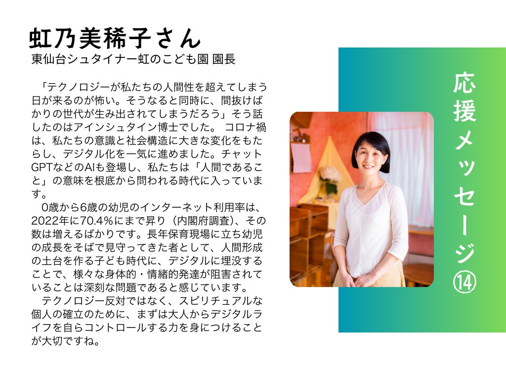 テクノロジー反対ではなく、スピリチュアルな個人の確立のために、まずは大人からデジタルライフを自らコントロールする力を身につけることが大切ですね。(虹乃美稀子さんより)