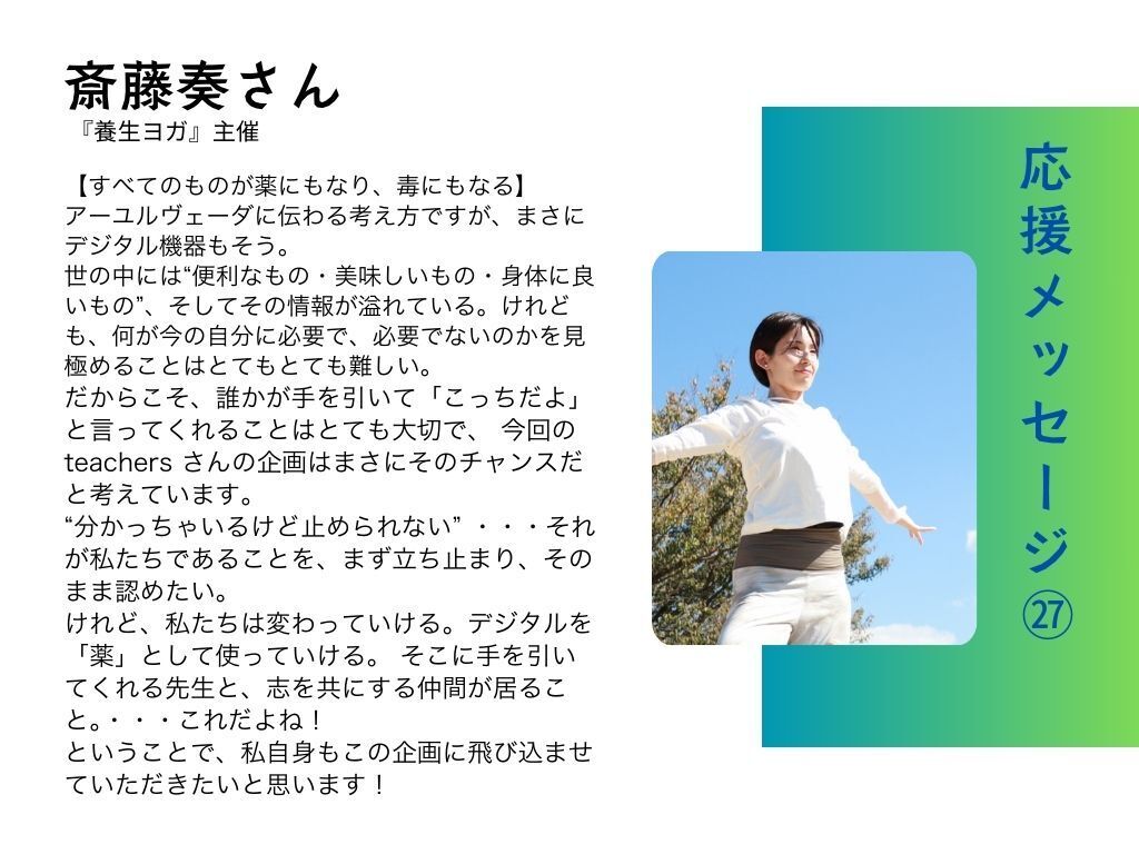 だからこそ、誰かが⼿を引いて「こっちだよ」と⾔ってくれることはとても⼤切で、今回のteachersさんの企画はまさにそのチャンスだと考えています。