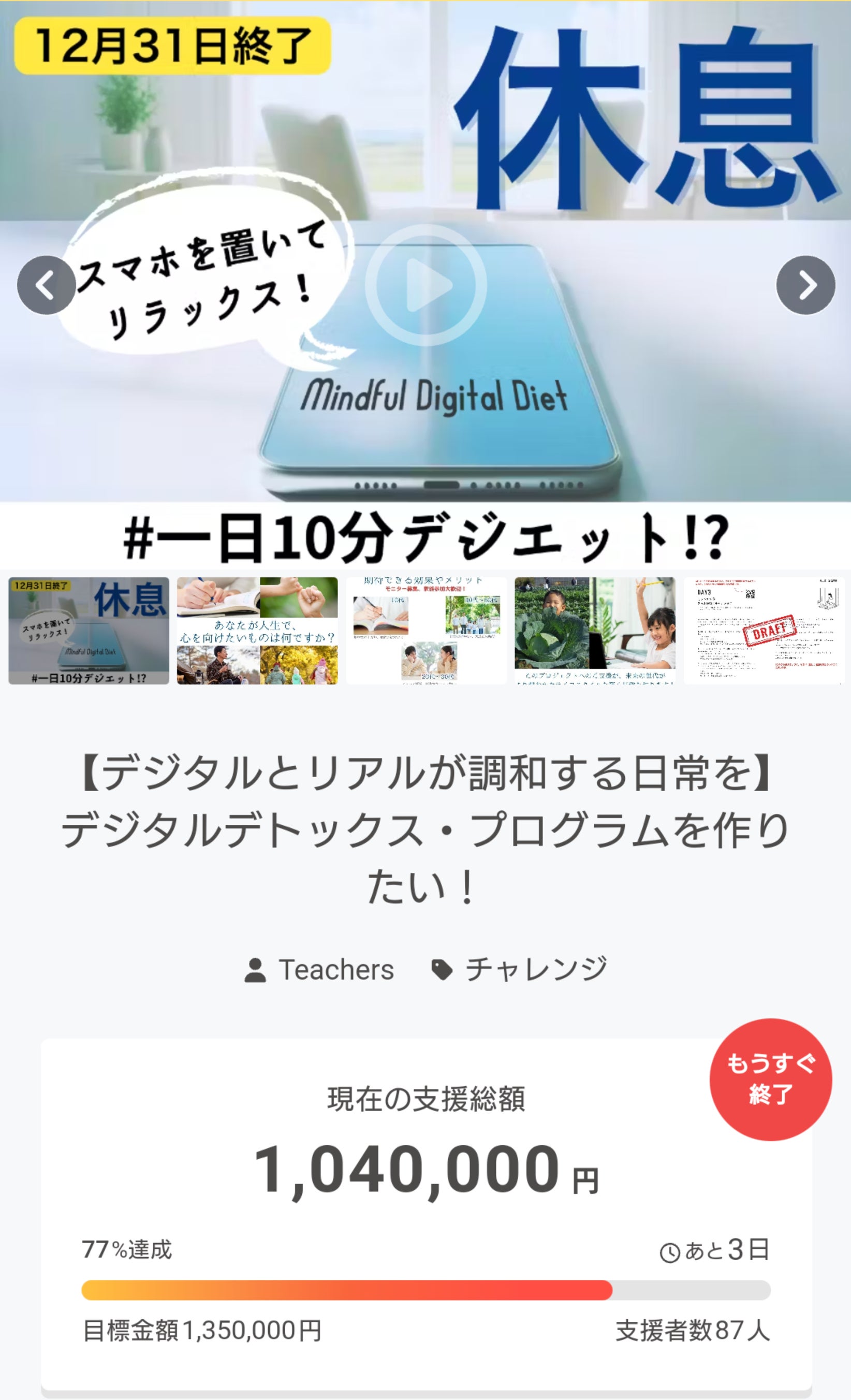 残り3日で100パーセント達成を目指すため、ぜひぜひプロジェクトページをご自身のSNSなどでシェアをしていただけますでしょうか。