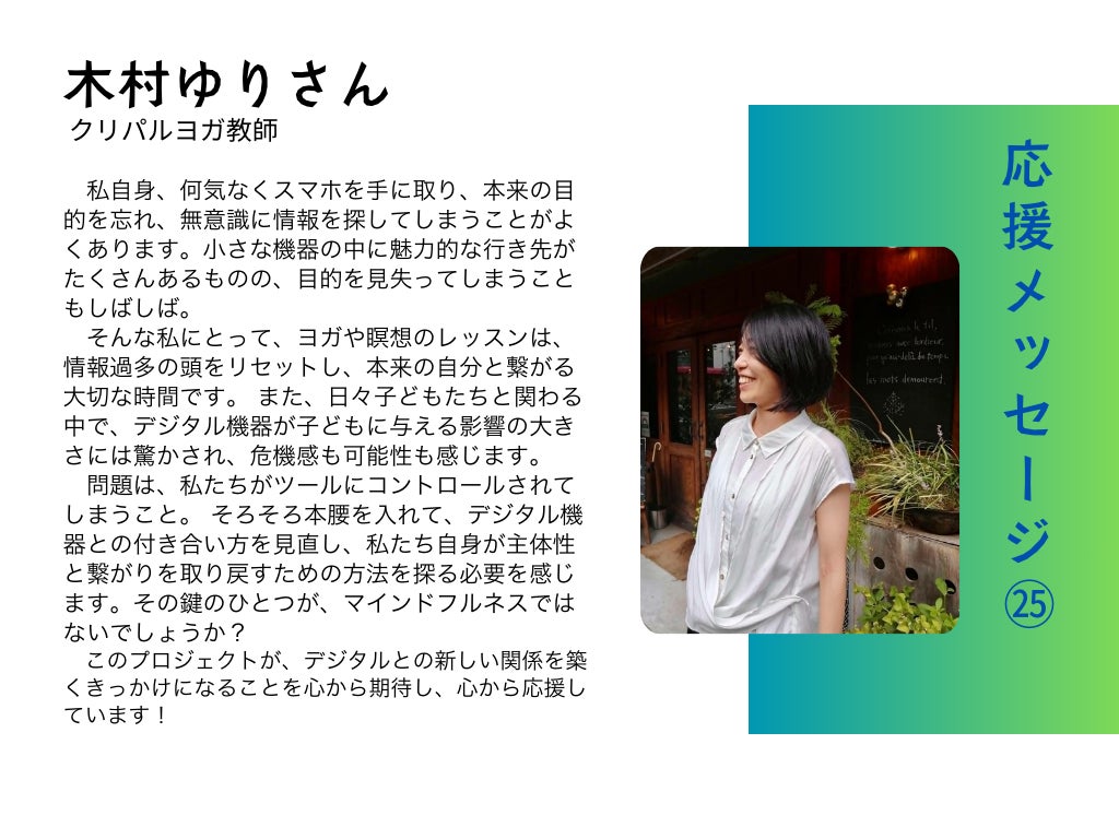みなさん、こんばんは!デジエットプログラムへのご関心と応援、本当にありがとうございます。少しずつですが、みなさんのおかげでこの取り組みが形になりつつあります。今回、MSC認定講師でありセルフ・コンパッション・サークル代表の海老原由佳さんからいただいた温かいメッセージに、心より感謝申し上げます。海老原由佳さんには、これまで何度も私たちのイベントにご登壇いただき、セルフ・コンパッションの大切さについて勇気をいただくお話を共有していただきました。とりわけ今年、私が力を注いだ「女性のための読書サークル」では、深い洞察に満ちたお話で多くの参加者に気づきを与えてくださいました。読書会を通じて、参加者のお一人お一人が自分自身を優しく見つめる方法を学び、より自分らしく生きるための第一歩を踏み出すためのきっかけを得ることができました。この場を借りて改めて感謝申し上げます。******************* デジタル機器がない時代を知っている昭和世代でさえ、今となってはPCやインターネット、携帯電話を手放すことなど考えられない時代。生まれたときからスマホやタブレットに触れている平成・令和生まれの世代はなおさらですよね。 「子どもたちのデジタル接触時間が長過ぎて心配だけど、どうしていいかわからない。何なら自分もスマホに依存気味…」なんていう方はきっと多いはず。そんな自分自身を責めてしまい、矛盾を抱えて苦しくなっている方もいるかも知れません。まずは親である私たち自身がデジタルとの関係を見直し、それを子どもたちに伝えていけたら理想ですね。 私自身はiPhoneの時間制限機能を使って、22:00以降は「休止時間」としています。これだけでもスマホ利用時間が大分減りました!デジタルデトックスについてご自身も試行錯誤されてきた中場牧子さんが想いを込めたこのプログラム「デジエット」、私も大いに期待しています!(海老原 由佳さん)*******************海老原さんがおっしゃるように、みなさんの中にも「子どものデジタル接触時間をどう減らせばいいのか悩んでいる」、「自分自身もスマホ依存を見直したい」と感じている方がいらっしゃるかもしれません。このプログラムは、そんな皆さんと一緒に試行錯誤しながら、デジタルとの新しい付き合い方を探る場にしていきたいと思っています。現在、「親子で取り組むデジタルデトックス」のテーマでワークショップを企画しており、来年3月には親子で楽しめる新しいアクティビティもご紹介できる予定です。引き続き、この取り組みを通じて、親子で心豊かに過ごせる時間をお届けしてまいります。最後になりますが、海老原さんをはじめ、これまで応援してくださったみなさんに改めて感謝を申し上げます。みなさんとともに、デジタルとの健やかな距離感を築いていけるよう、これからも全力で取り組んでまいります。現在の支援総額 833,500円https://camp-fire.jp/projects/809598/view残り5日となりました。最後まで頑張りますので、どうぞこれからもよろしくお願いいたします!Teachers中場 牧子