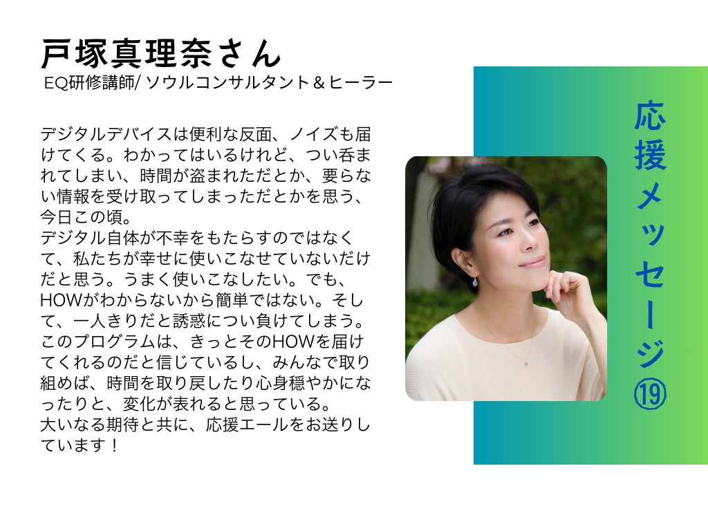みなさま、おはようございます!「日常でのデジタルデトックスを行うことは可能なのか?」この問いに対して、『スマホ断ち』読書会のデータをもとに、note記事を書いてみました。https://note.com/teachersapp/n/n2a33dd89cf055名の参加者のスマホ使用時間の推移をあらわしたグラフと、感想に、実際に行ったこと(マインドフルネス瞑想含む)ついてまとめています。ご自身やご家族のスマホ、デジタル機器の使い方について関心ある方は是非お読みください。あと残り14日。折り返し地点を過ぎ、残り2週間になりました。最後まで応援を、どうぞよろしくお願いいたします!Teachers中場牧子