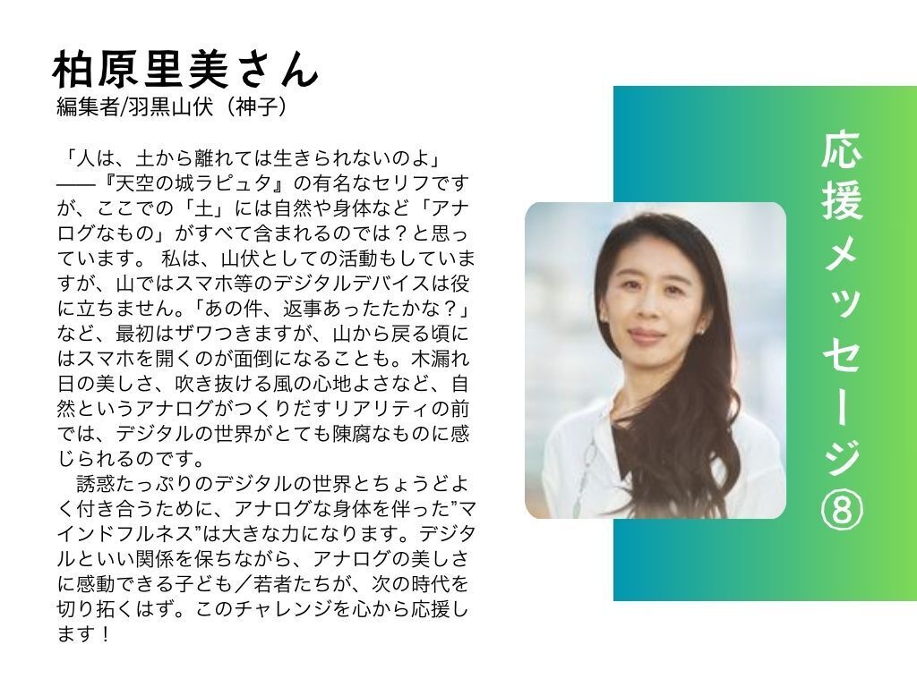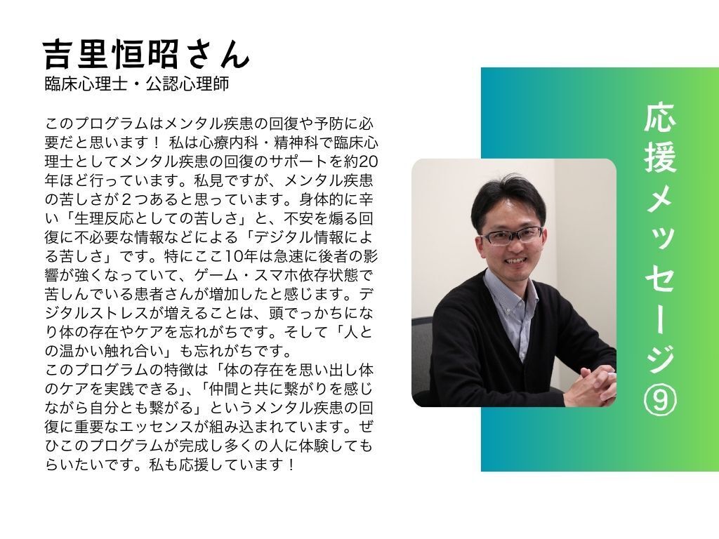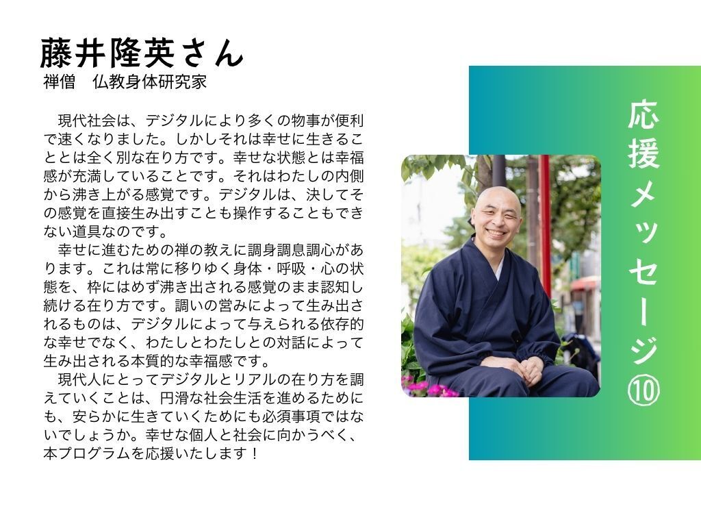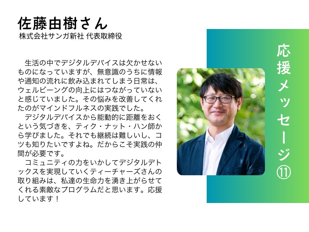 みなさん、おはようございます!Teachers の中場牧子です。この度、私たちの取り組みに対してサンガ新社代表 佐藤由樹さんより心強い応援メッセージをいただきました!サンガ新社さんとは共催イベントを開催させていただいたご縁があり、また、私自身が主催する読書会でも大変お世話になってきました。「生活の中でデジタルデバイスは欠かせないものになっていますが、無意識のうちに情報や通知の流れに飲み込まれてしまう日常は、ウェルビーングの向上にはつながっていないと感じていました。その悩みを改善してくれたのがマインドフルネスの実践でした。 デジタルデバイスから能動的に距離をおくという気づきを、ティク・ナット・ハン師から学びました。それでも継続は難しいし、コツも知りたいですよね。だからこそ実践の仲間が必要です。 コミュニティの力をいかしてデジタルデトックスを実現していくティーチャーズさんの取り組みは、私達の生命力を湧き上がらせてくれる素敵なプログラムだと思います。応援しています!」(佐藤由樹さん サンガ新社代表取締役) 私たちのプログラムが「生命力を湧き上がらせてくれる取り組み」とおっしゃっていただけたことは、私たちの励みとなり、大きな喜びでもあります。これからも、皆さまの期待に応えられるよう、デジタルデトックスを実現し、ウェルビーイングを高めるプログラム作りに尽力してまいります。応援してくださるすべての皆さまに、心から感謝申し上げます。現在の支援総額 471,500円50万円はもう目の前です。引き続きのご支援を、どうぞよろしくお願いいたします!Teachers中場牧子