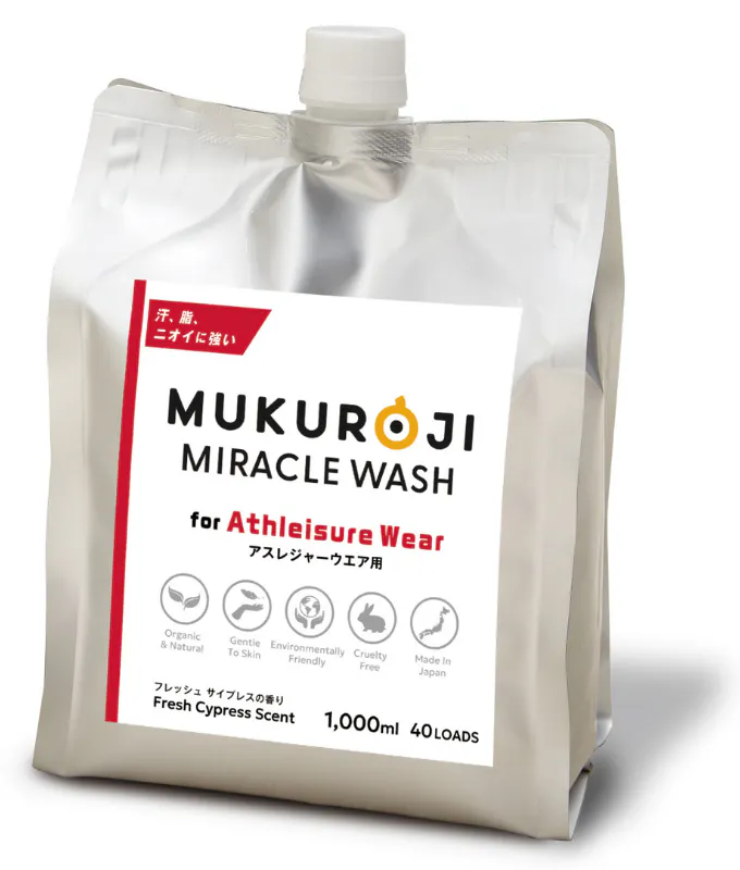 この「ムクロジ ミラクルウォッシュ」はムクロジという木の実の抽出エキスを主成分とするナチュラル洗剤でありながら、高い洗浄力に加えて、スポーツウエアを始めとする化学繊維でできた衣類に残りがちな汗・脂による臭いの除去にフォーカスした洗剤です。さらに、アレルギー対応や高い生分解性はもちろんのこと、ウエアの色褪せや毛羽立ちなどの劣化も防ぎます。