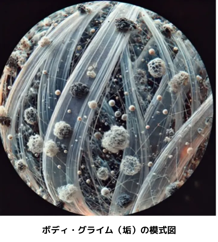 この複雑な構造によって繊維の間に入り込んだ汗や皮脂の汚れは落としにくく、使用を重ねるごとに蓄積し、雑菌が繁殖して臭いを発するようになります。この汚れは「ボディ・グライム(=垢)」や「バイオフィルム」と呼ばれ、普通の洗剤では落としにくく、それが臭いの原因だということがわかりました。