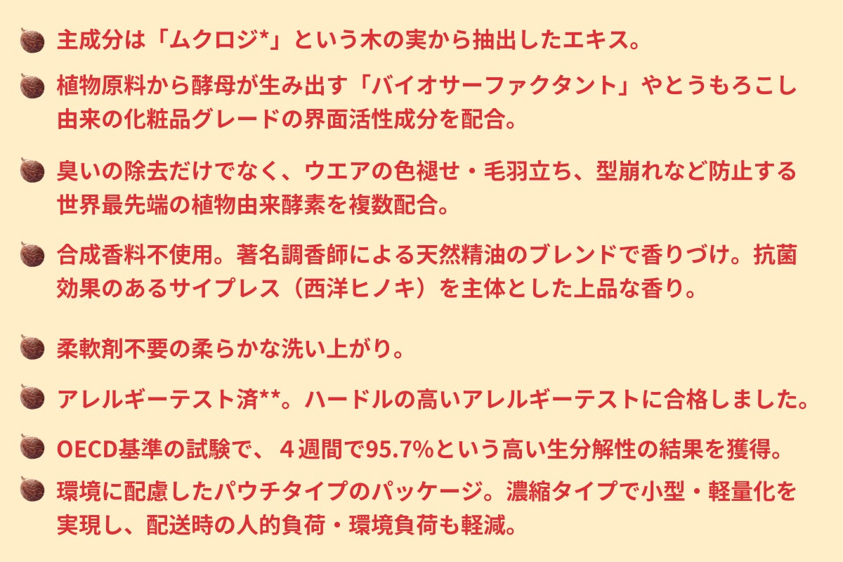 なお、繊維の毛羽立ちを抑える酵素を配合したこと、洗浄力をより高めるため洗剤原液のpHが弱アルカリ性に調整されていることにより、「ムクロジ ミラクルウォッシュ」はウールやシルクなどの動物由来の繊維を含んだ衣類での洗濯には使えませんのでご留意ください。
