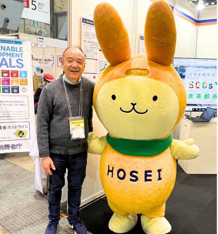 私と一緒に写真に写っているのは法政大学のマスコットキャラクター「えこぴょん」。会社を営みながら、週に1回キャリアデザイン学部で兼任講師を務めています。えこぴょんもお見知りおきのほど、よろしくお願いいたします。