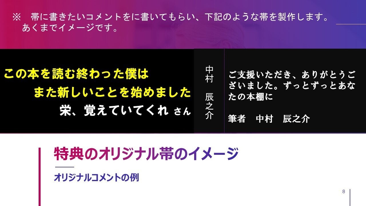 また、既に1冊目の本を買ってらっしゃる方に、同じ本をまた買っていただくのは申し訳ないです。しかし、もう出版されている本の内容は変えられません。そこで、書下ろしの文章やオリジナルの限定帯をリターンに入れることで、2冊目の本を購入することにも特別な意味を持たせたいと思いました。