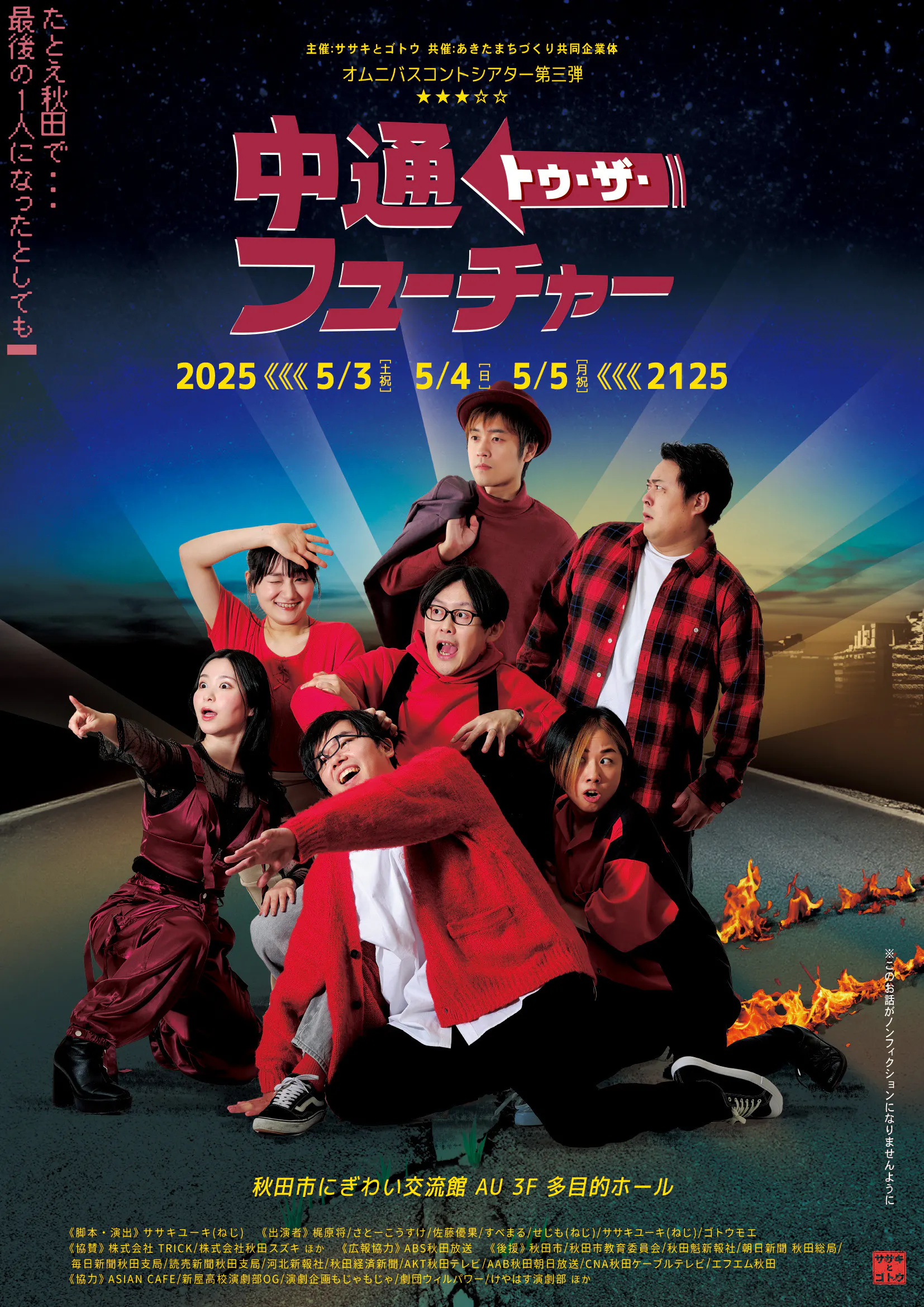 2025/04/28 17:44大変お待たせいたしました!クラファンリターン「サイン入り台本」を発送しておりますので、ご購入いただいた方はポストのチェックをお願いします。※こちらの台本はグッズとして販売もします!(サイン無し)そして、あっという間に今週末が本番となります。一般とペアチケットは前売購入がお得ですのでお早めにお買い求めください。このメンバーでの公演はこれっきり!秋田県産エンタメ、お見逃しなく!!======================オムニバスコントシアター第三弾「中通トゥ・ザ・フューチャー」秋田を消滅させないため彼らは未来から2025年の秋田にやってきた!GW恒例のオムニバスコントシアター第三弾は、秋田の課題を取り入れた超大作コント!【会場】秋田市にぎわい交流館AU3階多目的ホール【公演日時】※上演時間100分(予定)5月3日(土祝) ①開場14:00/開演15:00※初日のみ昼公演の開演時間が異なります5月4日(日) ②開場13:00/開演14:00 ③開場17:00/開演18:005月5日(月祝) ④開場13:00/開演14:00 ※アフタートークあり!【料金(全席自由・税込)】 [一般]前売3,000円/当日3,500円 [ペア(一般2人)]前売5,000円/当日5,500円 [大学生]前売当日ともに 1,000円 [高校生以下]前売当日ともに 500円 ※大学生、高校生以下は入場時要学生証 ※未就学児入場不可※客席内の一部にクラウドファンディング特典S席エリアがあります【プレイガイド】・ローソンチケット(Lコード:22770)https://l-tike.com/search/?lcd=22770※各公演の前日22:00まで販売・デザインチケットにぎわい交流館あう1階総合案内窓口※5/2(金)21:00まで販売【キャスト】 梶原将/さとーこうすけ/佐藤優果/すべまる/せじも(ねじ)/ササキユーキ(ねじ)/ゴトウモエ【スタッフ】作・演出:ササキユーキ音響:栗原崇(株式会社AVAND)照明:丸山成美(office 鳴海舞台A•P)舞台:木村哲也(株式会社ファンミュージックシステムズ)舞台装置:北嶋一美/小林瑛喜スチール写真撮影:コンドウダイスケ/星野慧(アキテッジ株式会社)動画撮影・編集:佐々木空袈(ssk)宣伝美術:後藤仁(ココラボラトリー)ヘアメイク:菅原瑶希(けやはす演劇部)スーパーバイザー:北嶋友暁(ファイオン株式会社)制作:ササキとゴトウ運営事務局協力: (五十音順) ASIAN CAFE/新屋高校演劇部OG/演劇企画もじゃもじゃ/きたのかい/劇団ウィルパワー/けやはす演劇部ほか【協賛】株式会社TRICK株式会社秋田スズキ ほか【広報協力】ABS秋田放送【後援】秋田市/秋田市教育委員会/秋田魁新報社/朝日新聞 秋田総局/毎日新聞秋田支局/読売新聞秋田支局/河北新報社/秋田経済新聞/AKT秋田テレビ/AAB秋田朝日放送/CNA秋田ケーブルテレビ/エフエム秋田【共催】あきたまちづくり共同企業体【主催】ササキとゴトウ======================= もっと見る