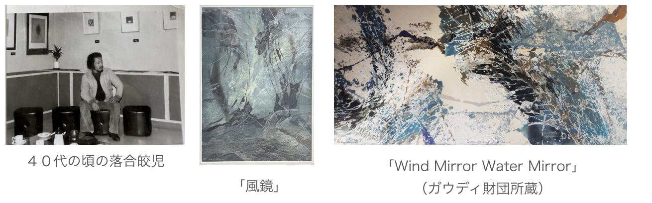 落合皎児の作風は年代によって様々ですが、特に評価が高かったのが、風や水という自然の造形に潜む美とそこに感応する人の心を表現したとされる「風鏡(wind mirror)シリーズ」や「水鏡(water mirror)シリーズ」でした。スペインで培った西洋の技術とセンスそして、東洋的で禅的な感性の融合が表れています。またこうした表現の原体験には父が15歳ごろの頃に兄を病気で失い、失意の中で海を眺め続けていたことが影響していると考えています。(日記に「水平線、波に、兄貴がいる」という記述も発見)
