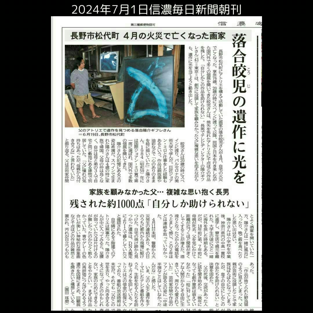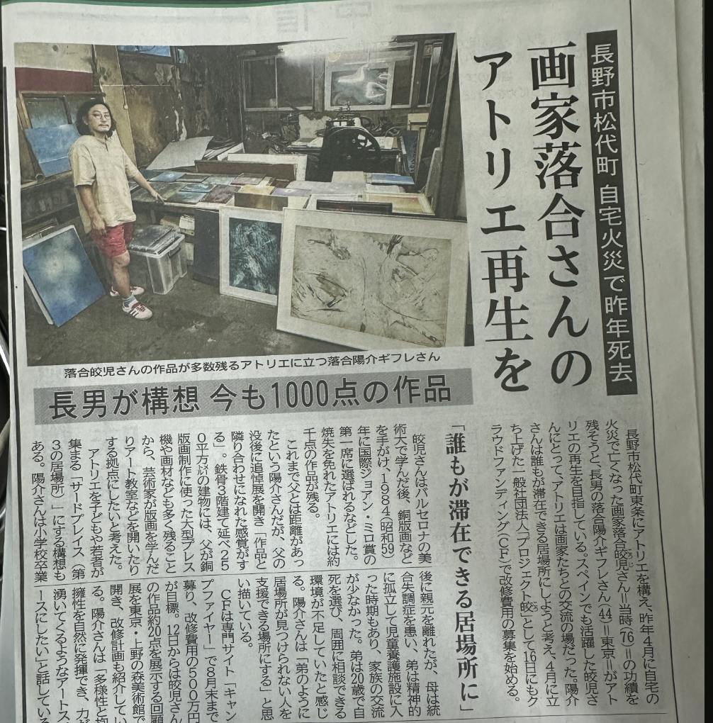 2025/07/17 10:18昨日から開始したクラウドファンディングについて、長野の新聞の取材を受けました、、!<信濃毎日新聞7月15日朝刊>https://camp-fire.jp/projects/862067/view記事にもありますが、今回の第二弾クラウドファンディングは落合皎児の作品を守り未来に繋げる上で、拠点確保・事業創造おいてもとても大切なプロジェクトとなります。上記URLの周知やシェアなど皆様のお力添えを賜われると大変幸いです。また現在、上野の森美術館ギャラリーにて落合皎児回顧展も開催中です。お近くにお越しの際はぜひともお立ち寄りくださいませ。詳細>https://www.ueno-mori.org/exhibitions/article.cgi?id=12468387何卒よろしくお願いいたします。ギフレ もっと見るクラファン第二弾に挑戦します