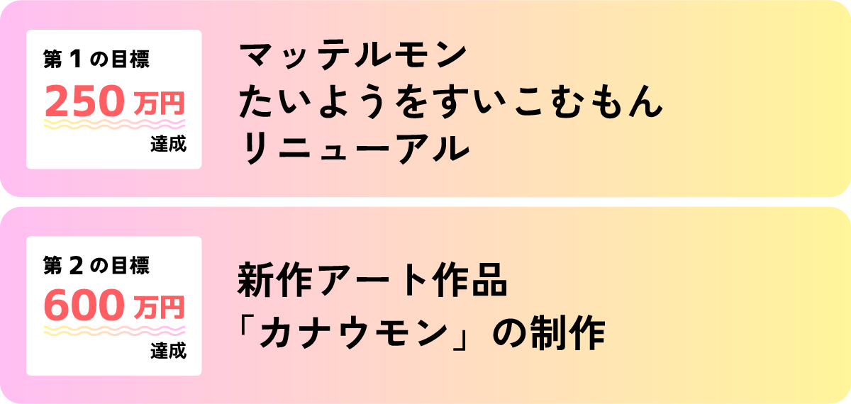 2025/04/16 09:00こんにちは。このたびは、クラウドファンディングへのご支援・ご協力を誠にありがとうございました。皆さまのおかげをもちまして、第1の目標金額であった「250万円」を無事に達成することができました。心より感謝申し上げます。一方で、第2の目標であった「600万円」には届かず、目標達成時に予定しておりました荒井良二さんによる「新作アート作品」の制作については、今回は見送らせていただくこととなりました。新作を楽しみにしてくださっていた皆さま、そして今回ご支援くださった皆さまには、心よりお詫び申し上げます。なお、マッテルモンのリニューアル作業はすでに完了しており、設置予定の「赤い門」の工事も4月中には終了の見込みです。いよいよ皆さまにお披露目できる日が近づいてまいりました。ぜひ、西大分・かんたん港園で、リニューアルした「マッテルモン」や「たいようをすいこむモン」に会いにお越しください! もっと見る