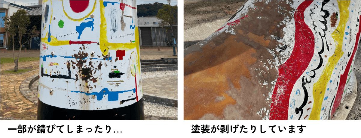 しかし設置からは10年が経過し、海沿いの激しい風雨にさらされて、2つの作品は悲しいほどにボロボロになってしまいました。