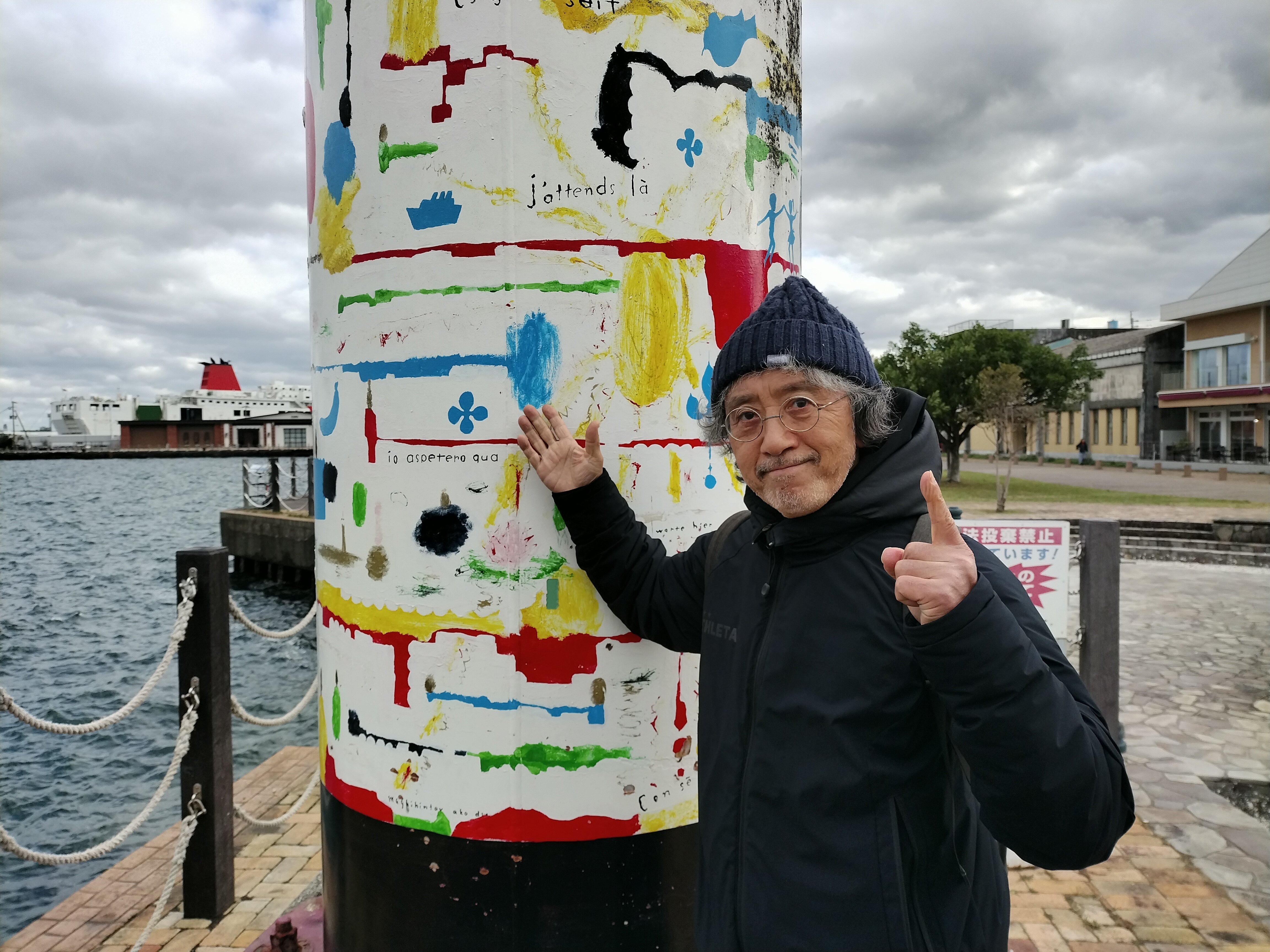 現在の「マッテルモン」のゲートの足元に描かれた荒井さんの作品。いろいろな国の言葉で「待ってるもん」と描かれています。実は今回のリニューアルで、この部分に新たに錆止めが塗られることになっており、残念ながら消えてしまいますが、その上から荒井さんが新しい言葉を描いて、「マッテルモン」は新たな作品として生まれ変わります。