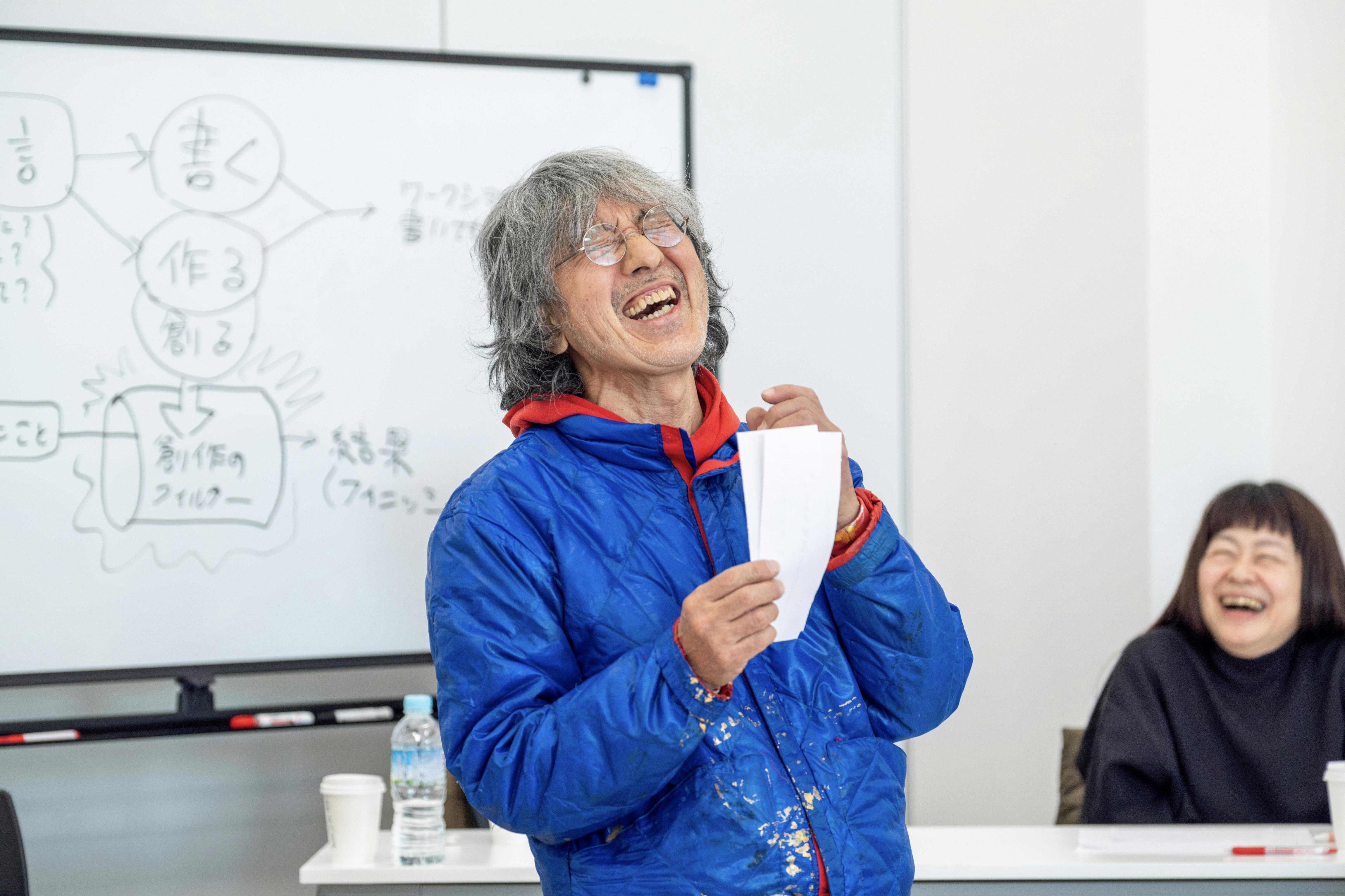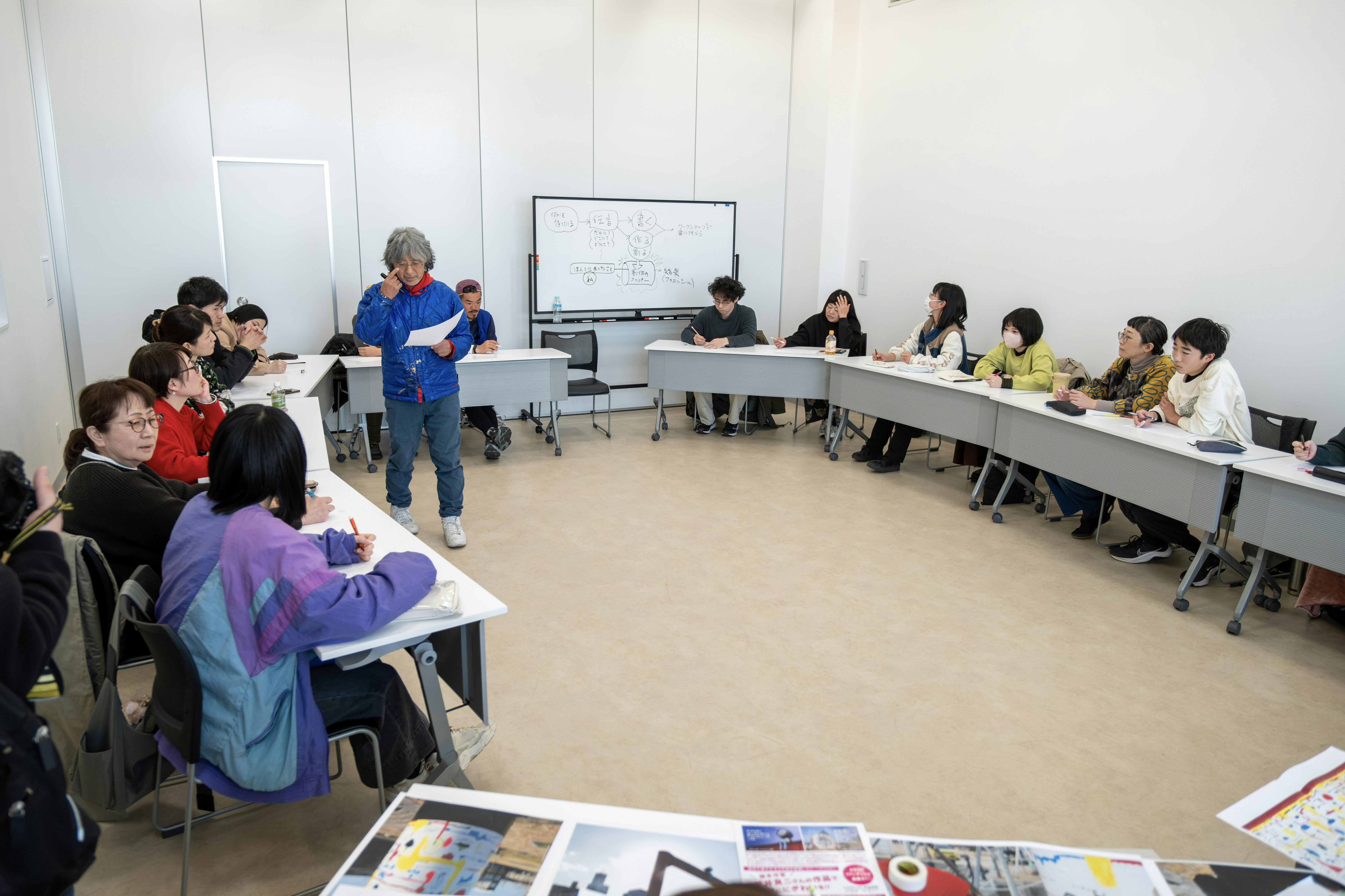 ワークショップでは、新たにドローイングする際に使う「言葉」を集めるため、大分県内から約20名に参加いただき、荒井さんから与えられたテーマ『伝言板』に沿って、未来につながる言葉を出し合いました。