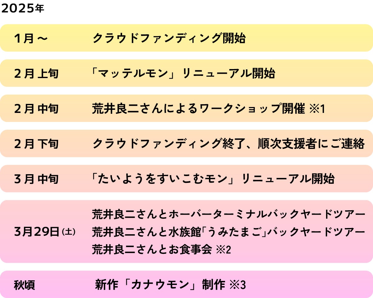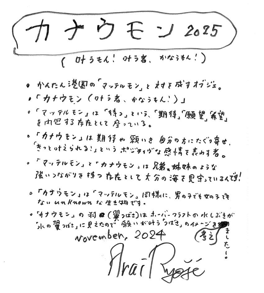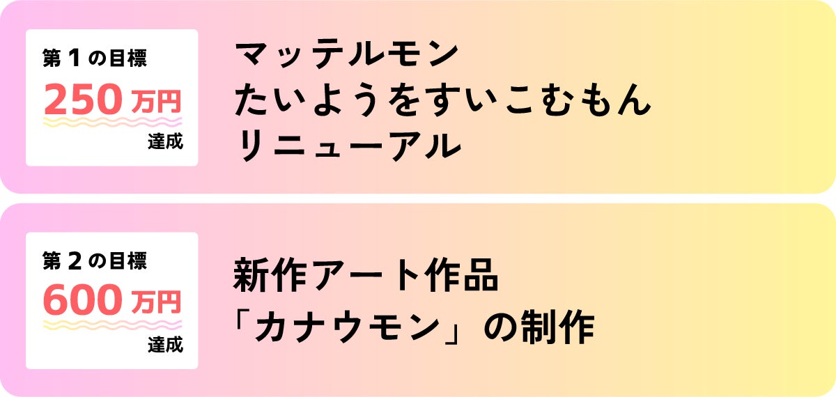 2025/04/16 09:00こんにちは。このたびは、クラウドファンディングへのご支援・ご協力を誠にありがとうございました。皆さまのおかげをもちまして、第1の目標金額であった「250万円」を無事に達成することができました。心より感謝申し上げます。一方で、第2の目標であった「600万円」には届かず、目標達成時に予定しておりました荒井良二さんによる「新作アート作品」の制作については、今回は見送らせていただくこととなりました。新作を楽しみにしてくださっていた皆さま、そして今回ご支援くださった皆さまには、心よりお詫び申し上げます。なお、マッテルモンのリニューアル作業はすでに完了しており、設置予定の「赤い門」の工事も4月中には終了の見込みです。いよいよ皆さまにお披露目できる日が近づいてまいりました。ぜひ、西大分・かんたん港園で、リニューアルした「マッテルモン」や「たいようをすいこむモン」に会いにお越しください! もっと見る