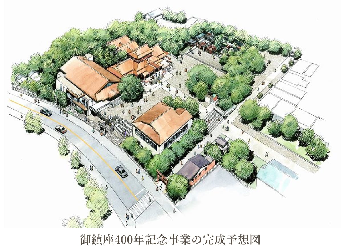そこで御鎮座400年を迎えるにあたり、耐震補強工事、その他大規模な修繕を施し、御祭神にはより荘厳かつ美しい新たな御社殿にお遷りいただきます。また、現在の社務所は取り壊し、新たに西側へ建設する計画です。東側は広く開放し、かつての戦前の境内を復元すると共に、バリアフリー化を実現した「どなたでも気軽に参拝できる現代的な神社空間」を目指しております。
