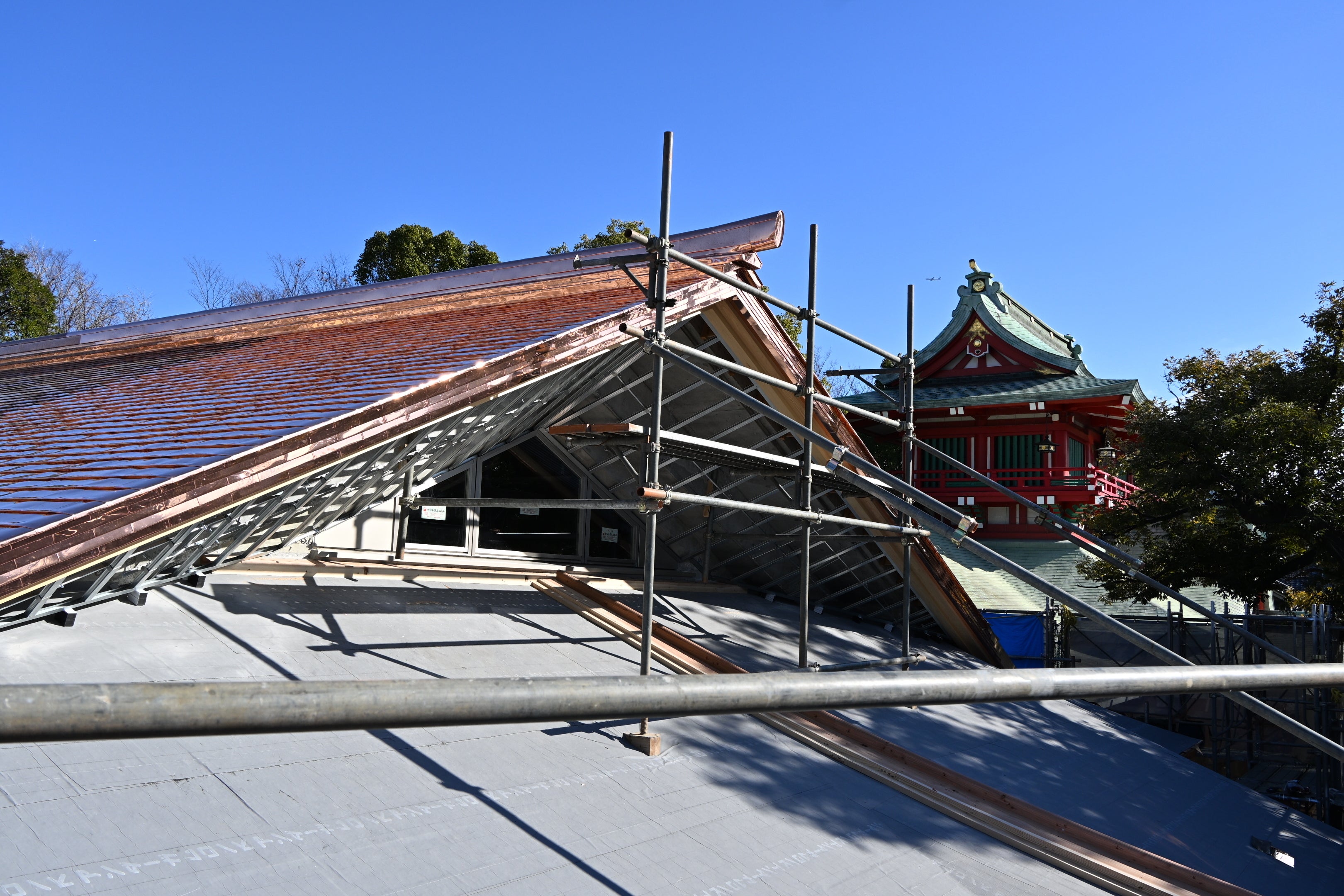 昨年行われた第1回クラウドファンディングでは351名の皆様からご支援を賜りました。改めて御礼申し上げます。おかげさまで御本殿の改修と境内整備工事も着々と進み、客殿(仮殿)では銅板のお屋根が張り付けられ、竣工まで約半年となりました。