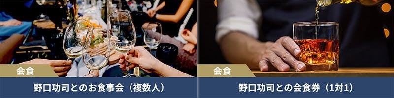 出版記念パーティーをはじめ、野口のネットワークを使った経営者交流会や直接会話ができる食事会など、交流を中心としたリターンを用意させていただきました。今までにない交流をすることで新しいビジネスチャンスが生まれるかもしれません。