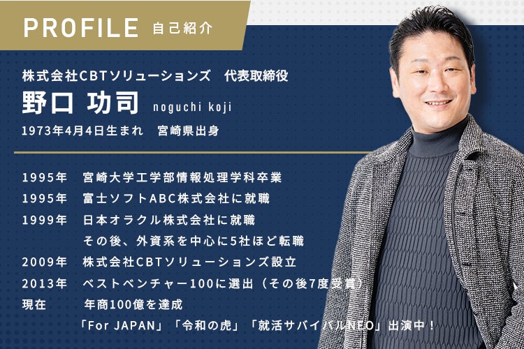 こんにちは。株式会社CBTソリューションズ 代表取締役 野口 功司(のぐち こうじ)です。たくさんのプロジェクトよりこちらのページを見ていただきありがとうございます。