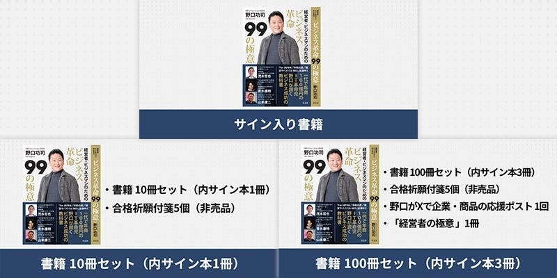 出版記念パーティーをはじめ、野口のネットワークを使った経営者交流会や直接会話ができる食事会など、交流を中心としたリターンを用意させていただきました。今までにない交流をすることで新しいビジネスチャンスが生まれるかもしれません。