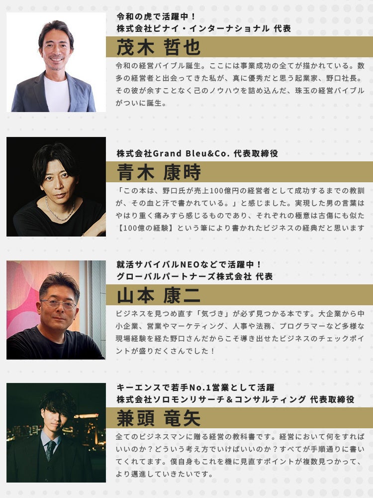本書を読んでビジネスについて学ぶ以外にも、野口が経営コンサルを行う特別なリターンを用意させていただきました。皆さんの悩みに、様々な角度からビジネスの指南ができると嬉しいです。
