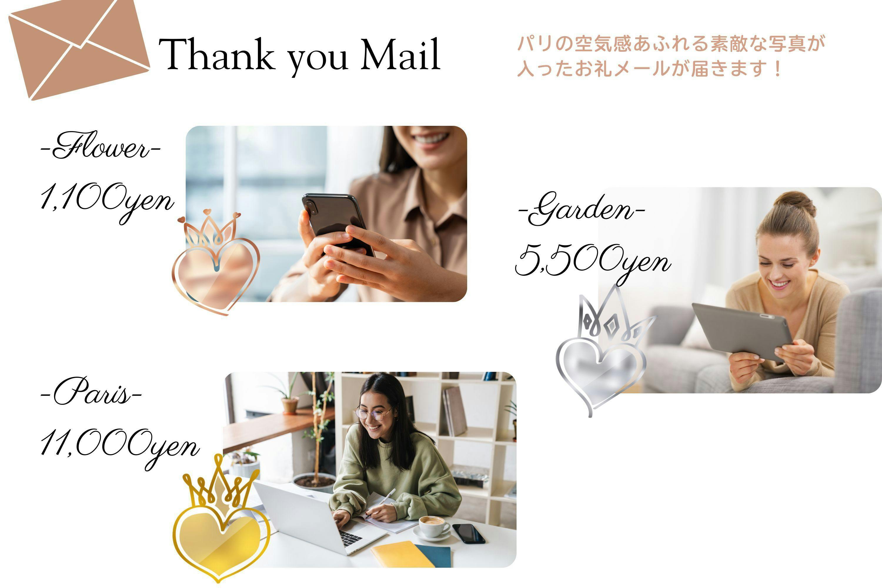 今回は、お礼の気持ちとして、9月29日にパリ市内で撮影した素敵な写真を付けたメールをお送りします。どんな写真が届くか、楽しみにしていてくださいね。お値段ごとに、Jardin des Costumesらしいネーミングを付けてみました(余談)。