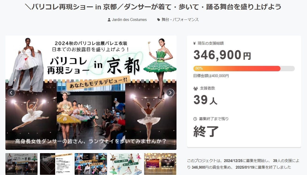 皆さま、こんばんは。月曜日の夜、いかがお過ごしでしょうか?昨日まで実施しておりました当プロジェクト、おかげさまで39名の方から346,900円ものご支援をいただき、無事終了いたしました。目標達成率は86%でした。皆さまの温かいメッセージやお声掛けが、毎日の心の支えとなりました。心より感謝しています。本当に、ありがとうございました。ここからは、3月23日のショーに向けて粛々と準備を進めてまいります。まずは、1月26日にモデルオーディション&ウォーキングレッスンを開催します。ショーに出演するダンサーの様子などをこの活動報告でお知らせしますので、見守っていただけたら嬉しいです。また、お選びくださったリターンも、順番にお送りいたします。少しお時間をいただくものもありますが、どうぞ楽しみにお待ちくださいね。では、本日の活動報告はここまで。今後ともよろしくお願いいたします。