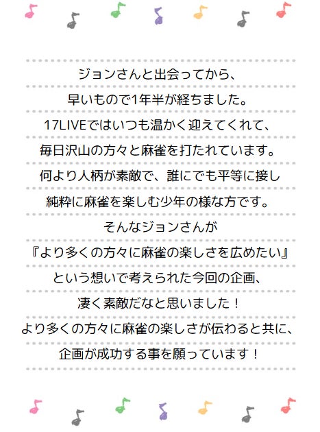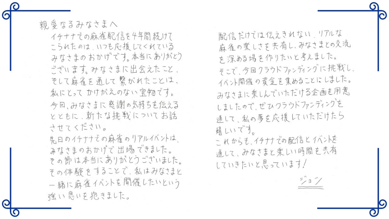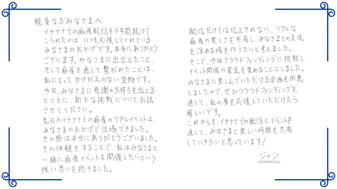 はじめまして。私は毎日17LIVE(イチナナ)という配信アプリで麻雀のライブ配信をしているジョンと申します。ゲームライバーとして毎日19~22時に配信しており、先月で配信4年目を迎えました。いつも見に来てくださっている方、本当にありがとうございます!私の気持ちは直筆で書かせて頂いたので、ぜひ読んでいただけると嬉しいです!どうぞよろしくお願いします!