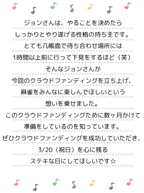 そして、「この麻雀の魅力を多くの人に感じてもらいたい!」と強く思うようになり、今回クラウドファンディングを行い自分でイベントを開催する事を決めました。