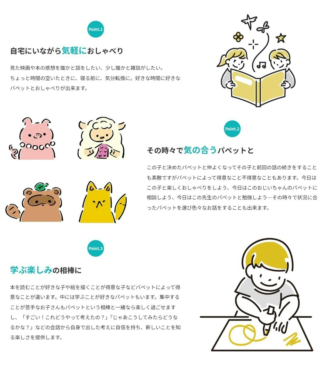 「パペットたちが暮らす町」というコンセプトで、サイト上にいる様々なパペットとオンラインで会話ができます。パペットたちはそれぞれひとりのキャラクターとして存在し、 ユーザーは自分のお気に入りの子を選び会話を楽しむことができます。 https://www.toytoitoy.com/