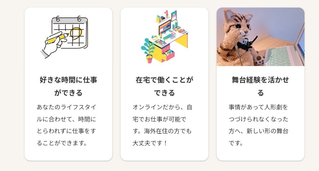 そんなことから人が流行病や怪我に左右されずにスキマ時間を使って人形操演者としてまた働けるオンラインの場を私が作りたいと考えるようになったのです。
