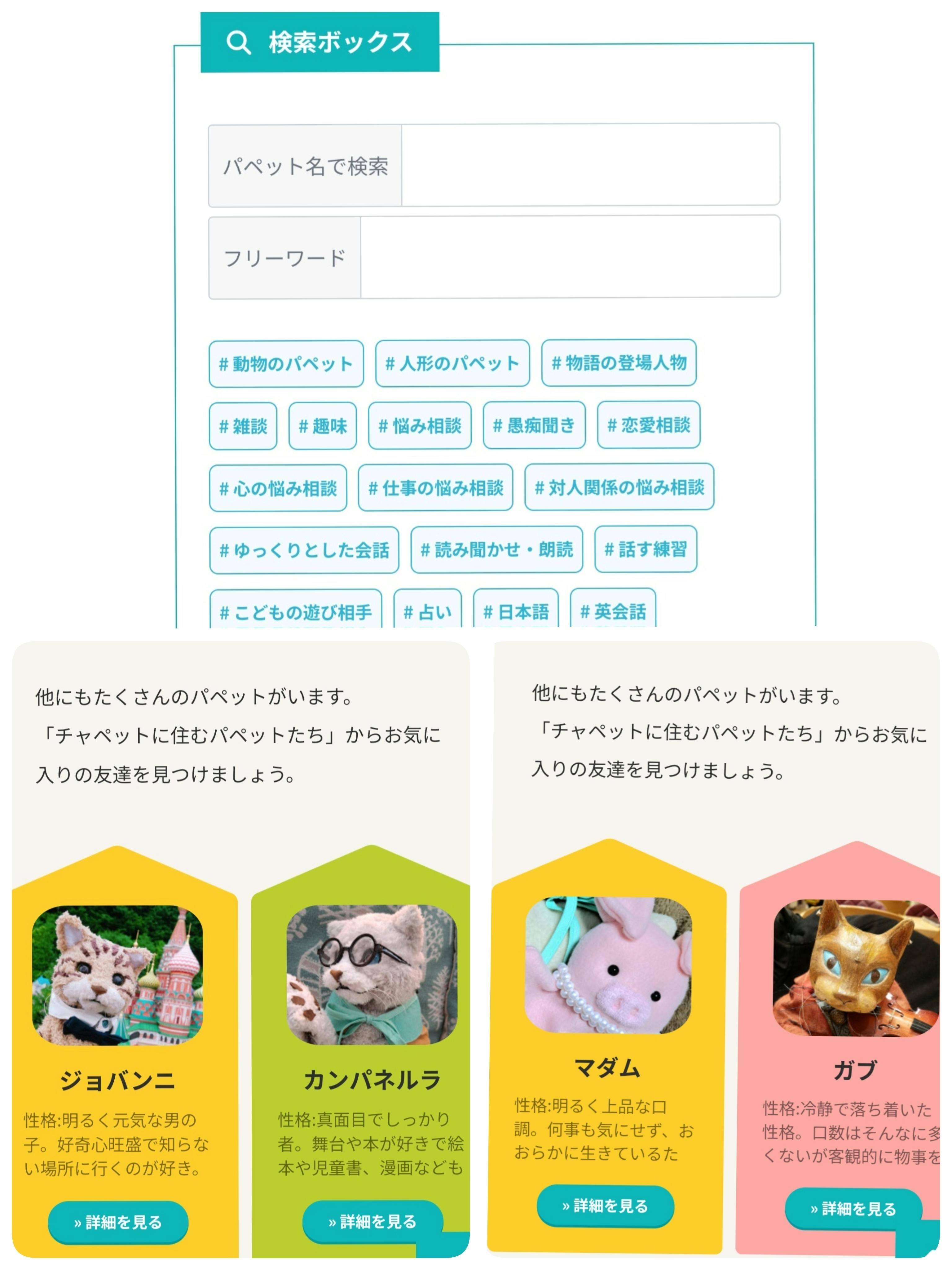 このように検索する機能もあるので、人型や動物型など見た目からパペットを選ぶことも、パペットたちの性格やキャラクターから選ぶことも、趣味の話や雑談などのエンタメや、会話の練習がしたいなどのカウンセリング、日本語勉強中の海外の人、学校の勉強など、 目的やジャンルに合ったものからパペットを選ぶこともできます!