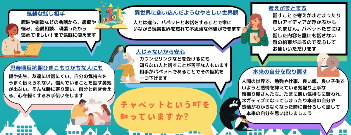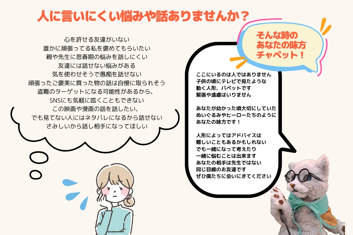 人形劇団時代、人見知りをする子がパペットに駆け寄ってくる経験が何度もありました。世の中には沢山のおしゃべり、相談サービスがあります。しかしそれを利用することに抵抗がある人も沢山いると思います。