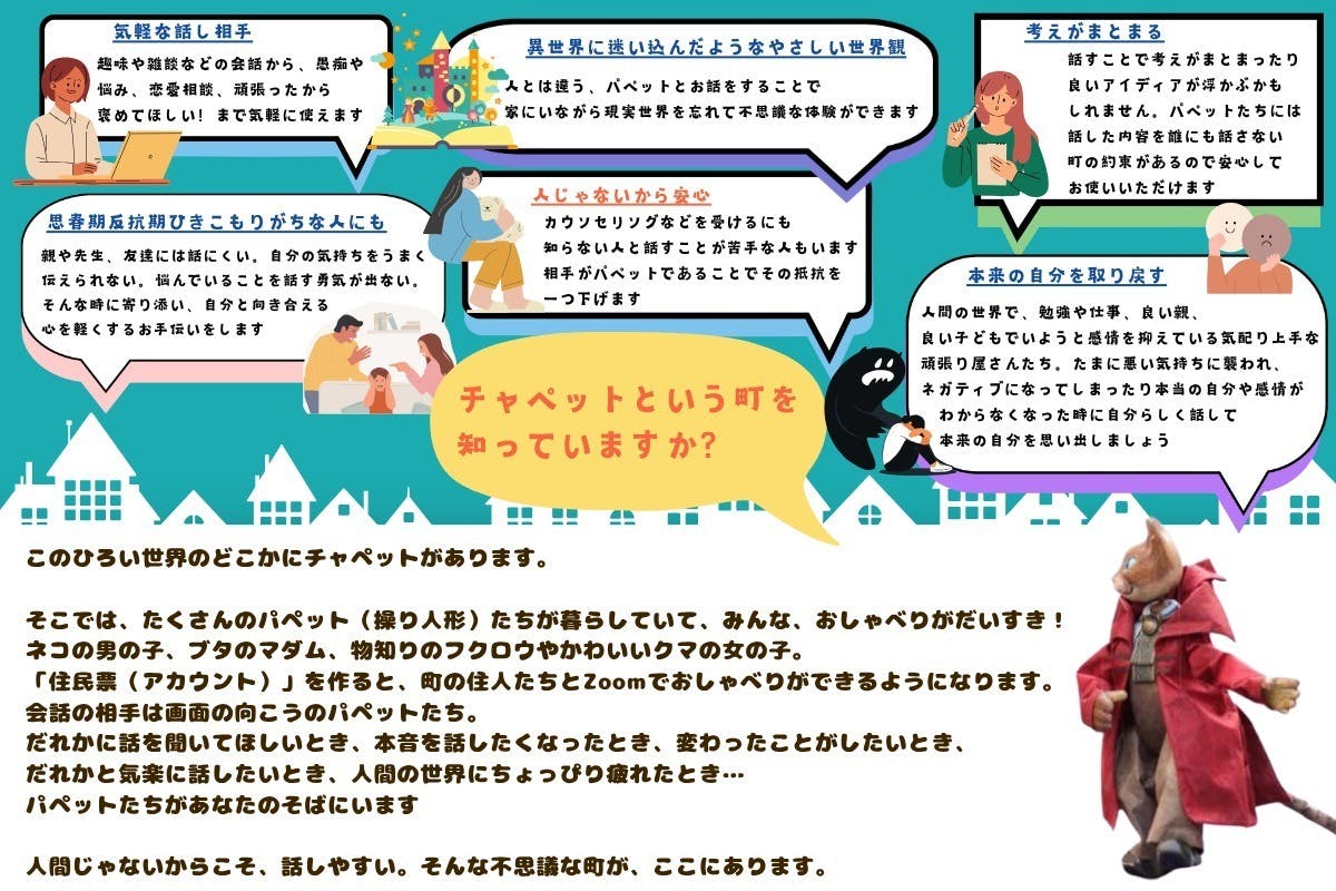 これはパペット(操り人形)によるオンライン会話サービスを色々な人に知ってもらいたい、パペットが身近になって欲しいというプロジェクトです。