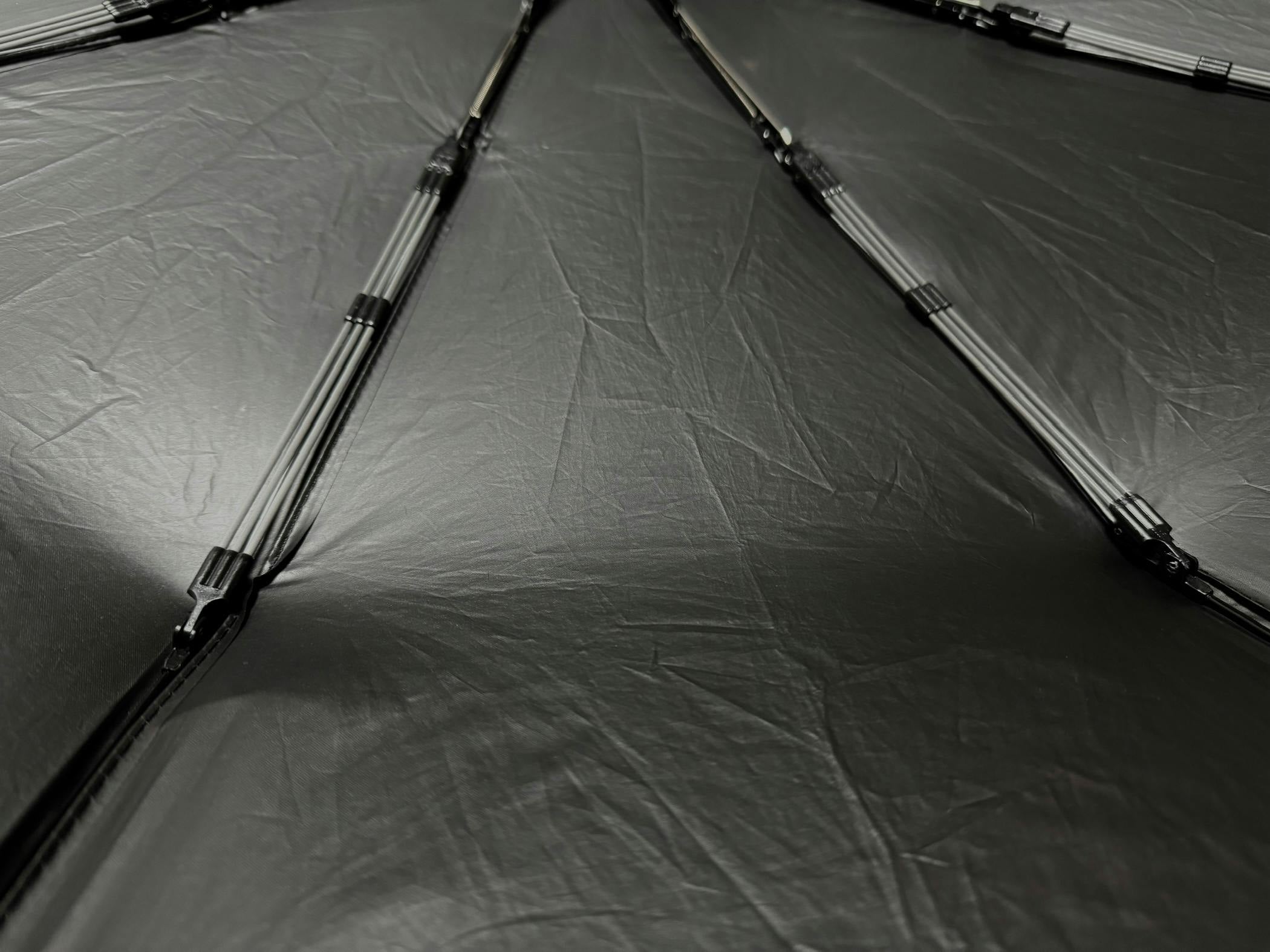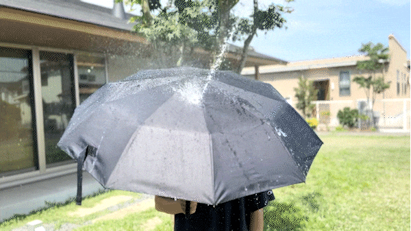 大きな円で、冷たい雨から守ってくれます。通常の折り畳み傘は直径90cm前後、ビニール傘は直径105cm程度。荷物があっても余裕でカバーできる大直径です。