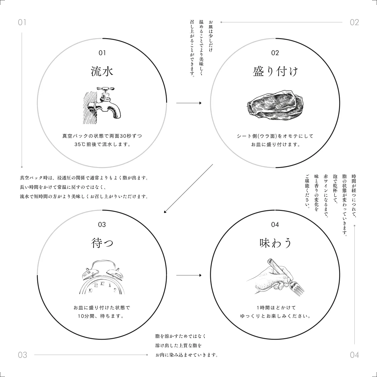 生ハムは、未開封のパックに常温の水を両面30秒ほど流し当て、その後お皿に並べて10分ほど空気に触れさせることをお勧めします。溶け出した上質な脂がお肉に染み込み、最高の食べ頃となります。
