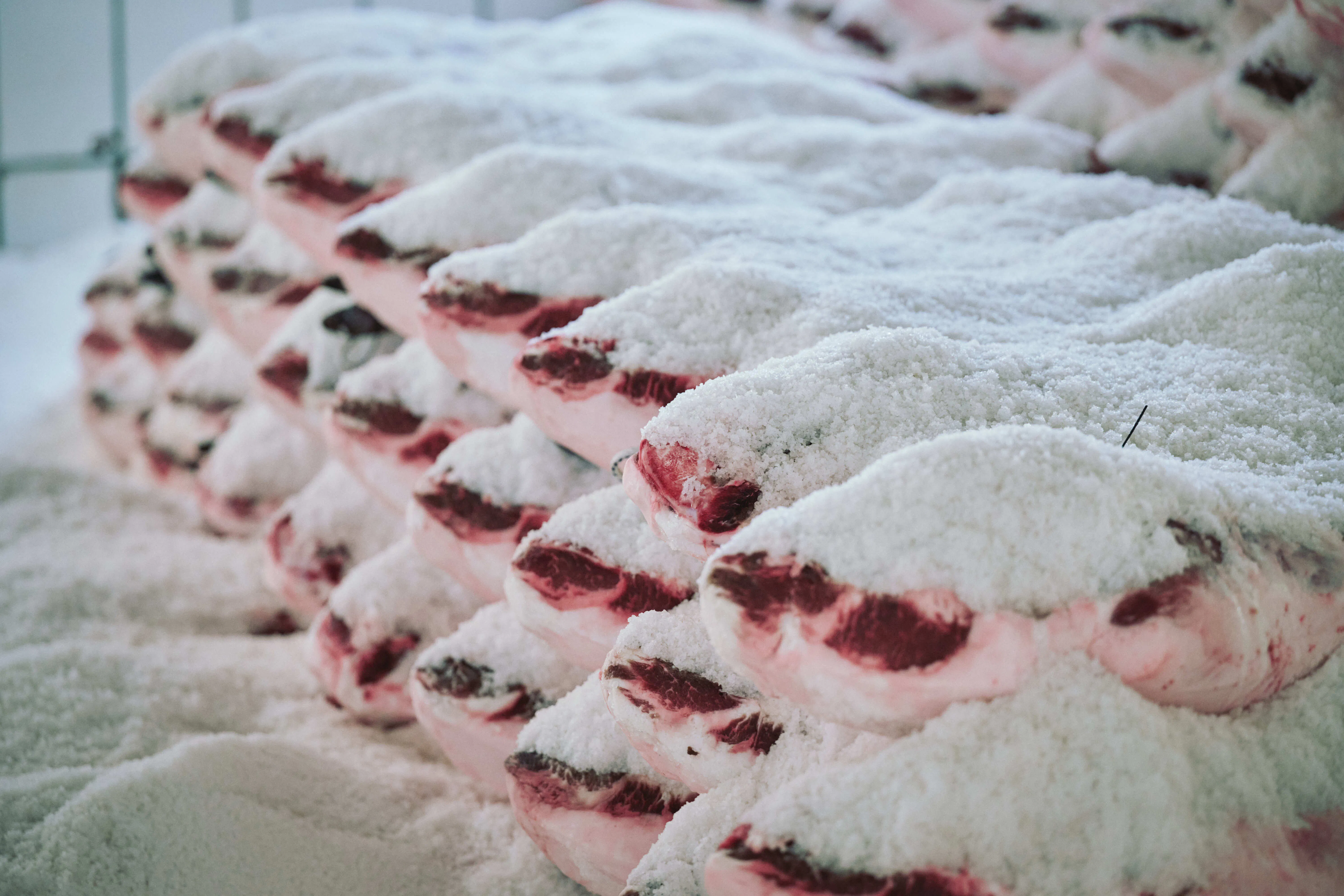 熟練の職人たちの手により、一頭一頭丁寧に解体され、生ハムに最適な形に整えられていきます。余分な部位を取り除き、長期熟成に耐えうる完璧な形に仕上げていく様は、まさに芸術と呼ぶに相応しい光景です。